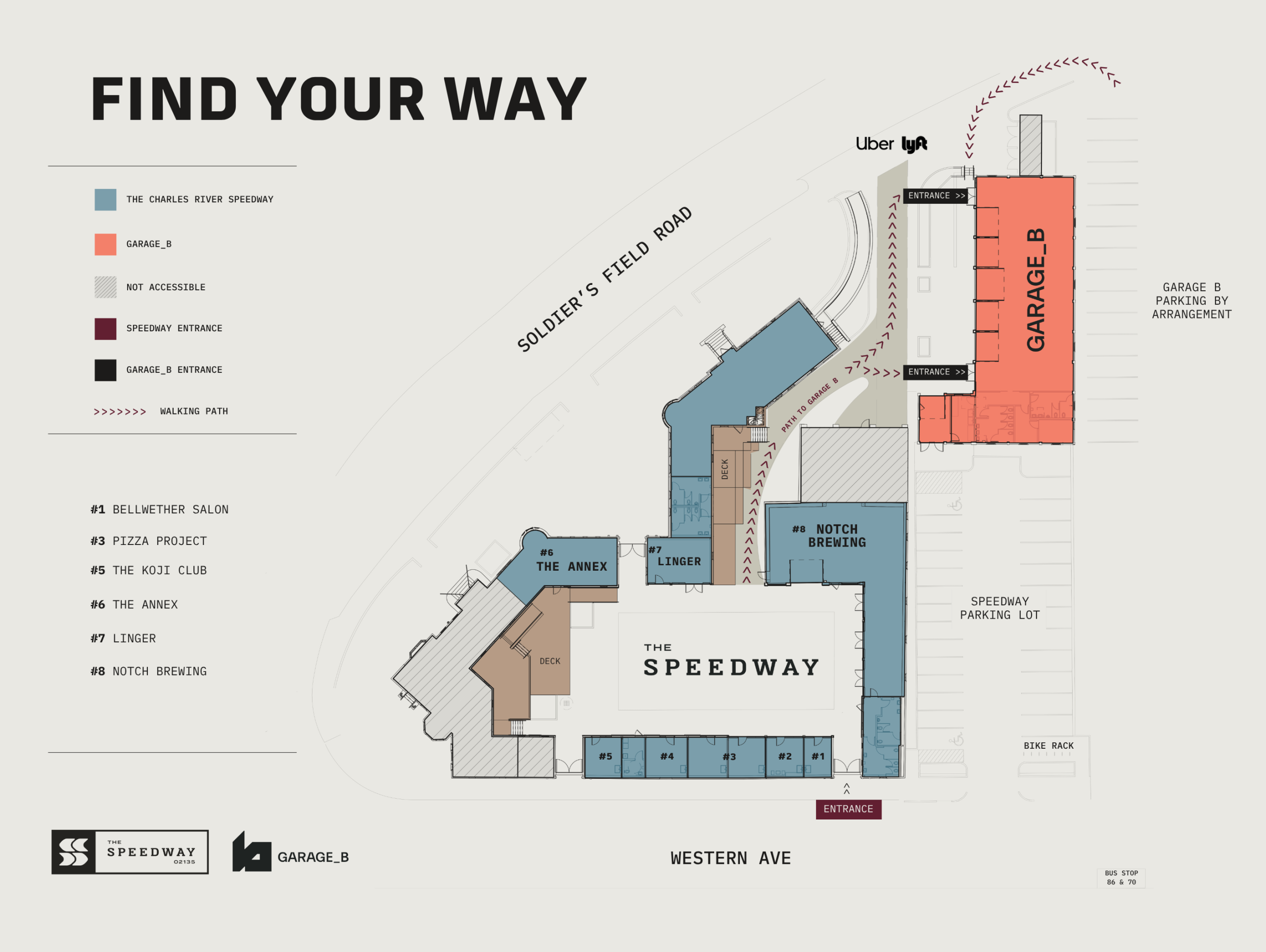 Located at the crossroads of Western Avenue and Arsenal Street at Soldiers Field Road, The Speedway is easily accessible from downtown Boston, Cambridge, Watertown, Newton, and beyond.